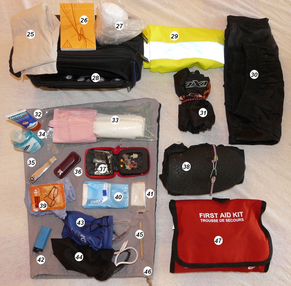 Le contenu de ce "kit de survie" peut vous sembler important, mais il est bien adapté à mon utilisation, pour faciliter mes roulages, mais aussi et surtout pour pouvoir faire repartir rapidement des balades de 5 à 30 motos en cas de problème au bord de la route. Bien sûr tout ne peut être prévu, et je n'ai pas de solution à tout... Certaines parties du kit (graissage, tenues de pluie, par exemple) restent souvent au garage pour les balades à la journée.Dans la soute sous la selle : ![]() 1 - Elf Past Chain (uniquement en voyage) 2 - Contrôleur de pression Michelin avec éclairage 3 - 8 m de corde résistance 1 tonne 4 - Mini bombe anti-crevaison protégée par adhésif tramé dans chaussette de sport (éviter frictions et risque d'éclatement intempestif) 5 - Pince multifonction 6 - Rouleau d'adhésif tramé 7 - Bloque disque avec cordon témoin (sous la selle ou dans le top case) 8 - Outil maison pour régler la précontrainte de la fourche 9 - Trombones (le petit peut remplacer le circlip de sélecteur...) 10 - Trousse à outils de la DL (dedans en + 2 m de ficelle) 11 - Fil électrique souple 2 conducteurs 1,2 m. 12 - Adhésif transparent (éviter les points de friction lors de certains transports) 12 - gants latex 12 - 2 préservatifs + Cellofrais plié dans une enveloppe (réparation de clignos, étanchéité GPS,...) 13 - Kit de réparation tubeless de chez RAD (mèches). 14 - Pinces de démarrage "maison" 1m50 15 - Brosse à dent pour graisser la chaine dans chiffon (uniquement en voyage) 16 - Pinceau pour huilage de la chaine dans chiffon 17 - Rislans de différentes dimensions 18 - Embout de sélecteur de remplacement (voir tuto) 19 - Levier de frein 20 - Fil de fer fin recuit 1 m 21 - Couvercle de bocal pour la béquille latérale 22 - 2 sandows de 60 cm (absents sur la photo) 23 - Petite lampe dynamo (1er prix Décath - absent sur la photo) 24 - Petit flacon (origine ophtalmo) d'huile moteur pour huilage de la chaine (1 flacon = environ 10 huilages). ![]() Une fois tout regroupé dans les différents emballages, c'est prêt à rentrer dans la soute de selle. Quand je pars avec le tube de Elf Past chain et la brosse à dent, le bloque disque passe dans le top case. Poids total des objets stockés sous la selle : 3,5 kg (dont la trousse à outils d'origine = 0,9 kg) Le contenu de la photo ci-dessous est réparti entre la sacoche de réservoir et le top case. ![]() 25 - Chiffon 26 - Bloc 27 - Sacs en plastique différentes dimensions 28 - Trousse de toilettes à compartiments (tout rentre sauf vêtements de pluie gilet fluo et trousse de secours) 29 - Gilet fluo 30 - Pantalon de pluie 31 - Surgants de pluie 32 - Crème de protection solaire 33 - PQ et essuie tout 34 - Gel nettoyant sans eau pour les mains 35 - Coupe ongles 36 - Canif 37 - Bouchons d'oreilles (Alpine & Alvis en cours de test) 38 - Surbottes 39 - Lingettes essuie lunettes 40 - Mouchoirs en papier 41 - Petit savon d'hôtel 42 - Briquet 43 - Lunettes non teintées 44 - Lunettes de soleil 45 - Crayon 46 - Sac de top case (découpé et cousu dans une jambe de bermuda) voir ci-dessous. 47 - Trousse de secours optimisée grâce aux bons conseils d'un pharmacien du forum ![]() Le sac de top case contient la panoplie de pluie, le gilet fluo + des compléments saisonniers (sous gants, gants d'été ou d'hiver, tours de cous, cagoules...) En hiver, la panoplie de pluie reste à la maison, toute ma tenue d'hiver est étanche. Copyright - © Toute reproduction partielle ou totale des textes et photos de ce site est interdite sans autorisation écrite préalable |