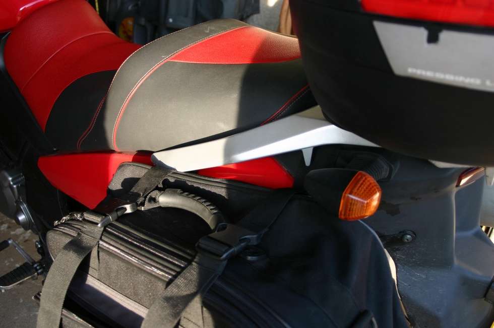 Pour positionner les sacoches souples en passant les sangles sous la selle. Positionner les sacoches et assembler les 2 sangles arrières Repousser les sangles sous le porte paquet, ça passe juste, avantage ça assure le bon accrochage des scratchs Ensuite assembler les 2 sangles avant, qui tombent juste devant le verrou de selle La selle se remet en place sans problème. Vue arrière des sacoches en place, l'équilibrage de la position des sacoches se fait par ajustements successifs. Copyright - © Toute reproduction partielle ou totale des textes et photos de ce site est interdite sans autorisation écrite préalable |