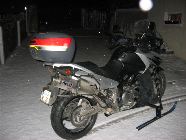 Avertissement : Le montage ci-dessous n'est pas homologué pour une utilisation sur route. - tout accident sur la voie publique avec ce genre d'accessoires montés (difficiles à planquer en plus) verra votre assureur décliner toute responsabilité. - D'éventuelles rencontres fortuites avec des agents de la force publique vous permettront de tester leur souplesse proverbiale vis à vis de la réglementation, ainsi que toute l'étendue de votre charisme.... Bégé ![]() ![]() ![]() ![]() ![]() ![]() ![]() ![]() ![]() Recit d'une sortie neige : une V-strom à Skis ca marche !... ou plutot ca glisse Alice ! Oh Yes ! Quel pied de pouvoir faire de la bécane sans craindre de coucher sur un flanc ! Ça y est, les premiers flocons de la saison ont été bénéfique car j'ai enfin pu tester en grandeur nature ma réalisation spéciale Eleph '. Round 1 : ![]() ![]() ![]() ![]() Les premiers tours de roue on été quelques peu scabreux, en réglages skis au plus bas j'ai fait un tout droit qui m'a refroidi net ... perception de la clé de 17 et remontée au 1er cran au lieu du troisième.... ![]() Là, deuxième essai fructueux et virages possibles ...ouf ... ![]() Round 2 : A plat c'est bon, les grandes courbes aussi, reste à voir en TT, alors perception du premier carré d'herbe et GAZ ! ....vite calme car la motricité ne passe pas et le poids de la bête liée à la sculpture routière des pneus trail ne permet pas de sortir vite de cette herbe gorgée d'eau et de neige, je fais des tranchées... en 2eme pareil ... ![]() ![]() ![]() ![]() Round 3 : "col de la petite suisse" pas mieux... manque de grip avec la fonte du dessous ça fait de la soupe et un beau verglas, ça patine...retour au camp de base... ![]() ![]() ![]() ![]() ![]() Round 4 : Là ça va chier... Je monte une corde nylon, car les rilsan je me dis qu'au premier jet de chevaux j'arrache tout - j'aime bien gazer...c'est pas de ma faute, c'est inné... Là sur 2kms nickel ça trop ça ne glisse plus je peux gazer et ça passe bien au sol... mais trop beau... un claquement m'alerte....u n morceau de corde est dans la couronne et a entrepris le protège chaîne... pas bon.... Stop j' enlève tout à la lampe frontale... et hop c'est reparti à l'arrache jusqu'en haut du col pneu nu et en recherche permanente de grip dans les accotements zig zag sur toute la largeur et ça monte....! SUPER ! j'y suis !!! ![]() Bon maintenant ça rigole plus il faut redescendre... et là c'est chaud aussitôt que je ralentis le frein moteur me fait glisser la chiotte sur 10metres je raccelere et reprend le cap et ralentis en douceur... virage... attention je pose une ski, m'appuie la botte sur l'arriere du ski et raccelere pour faire glisser et hop ça passe, c'est booooo quand ça passe ! Oui parce que des fois tu restes posé sur le ski direction l' accotement... il faut alors stopper net et rebasculer vers la route d'un coup de pied du tonnerre, là l' expérience d'enduriste intervient... c'est chaud et il fait chaud sous le casque.. (j'ai pris le casque de cross ce coup ci...tu as vite chaud sur la neige pas besoin de gros pull.. juste la combine et un sweet..) Retour au bled et quelques coup de gaz rageur de plaisir devant la barque des copains mais ça dort ou regarde je ne sais quel film au lieu de se promener tranquillement sous la neige en tenue de plongée et bottes canadiennes !...quel gâchis... Bon vivement demain que je remette cela mais peut être avec la KTM et 100 kilos de moins ça être top même sans les skis ! ![]() @+ en espérant que ce récit tout frais sorti vous aura donné des envies ! Montage des chaines sur la DL 650 Après quelques réflexion et analyse je me suis attelé à transformer un jeu de chaîne de 309 de 1988 en un outil idéal pour tracter et faire passer la puissance de mon twin non poussif dans la neige. ![]() Le système fonctionne sans aucun problème majeur...si un il me manque du testing en grandeur nature avec la neige vu qu'elle ne m'a pas attendue et a déjà fondu ! ![]() A l'avant j'ai adopté le système sandows continu, souple et facile d'utilisation et moins dangereux qu'une corde... ![]() VIDÉOS DE LA DL A SKIS DE KEKER AUX ELEFANTENTREFFEN 2009 : Vidéo 1 - V strom avec skis aux éléphants Vidéo 2 - V strom avec skis aux éléphants Vidéo 3 - V strom avec skis aux éléphants filmée par un italien Par ailleurs sa DL est dans la vie de la moto de Mars en gros plan de la page 2 et illustre l'article sur les eleph en général et l'année 2009 à Solla et au Nürbürgring. ![]() Copyright - © Toute reproduction partielle ou totale des textes et photos de ce site est interdite sans autorisation écrite préalable |